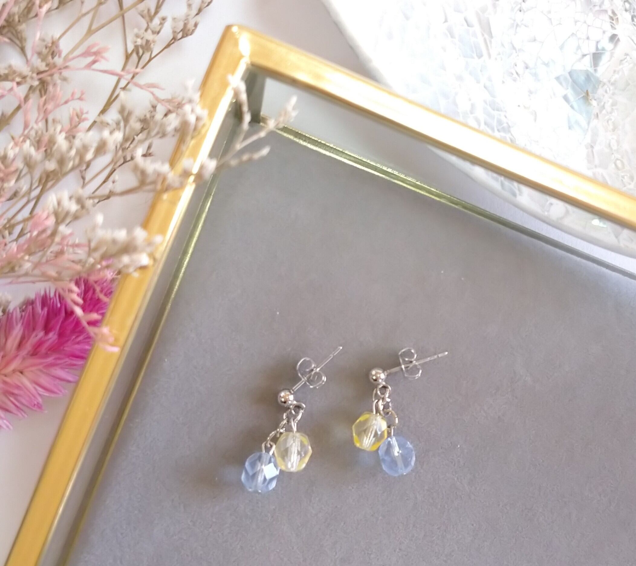 水色×黄色のクリアビーズを使用。 爽やかな夏っぽさのあるイメージで作成しました。 小ぶりなので控えめな雰囲気です。 黄色ビーズ 6㎜ 水色ビーズ 6㎜ *ピアス、イヤリング、樹脂ノンホールピアス選べます
