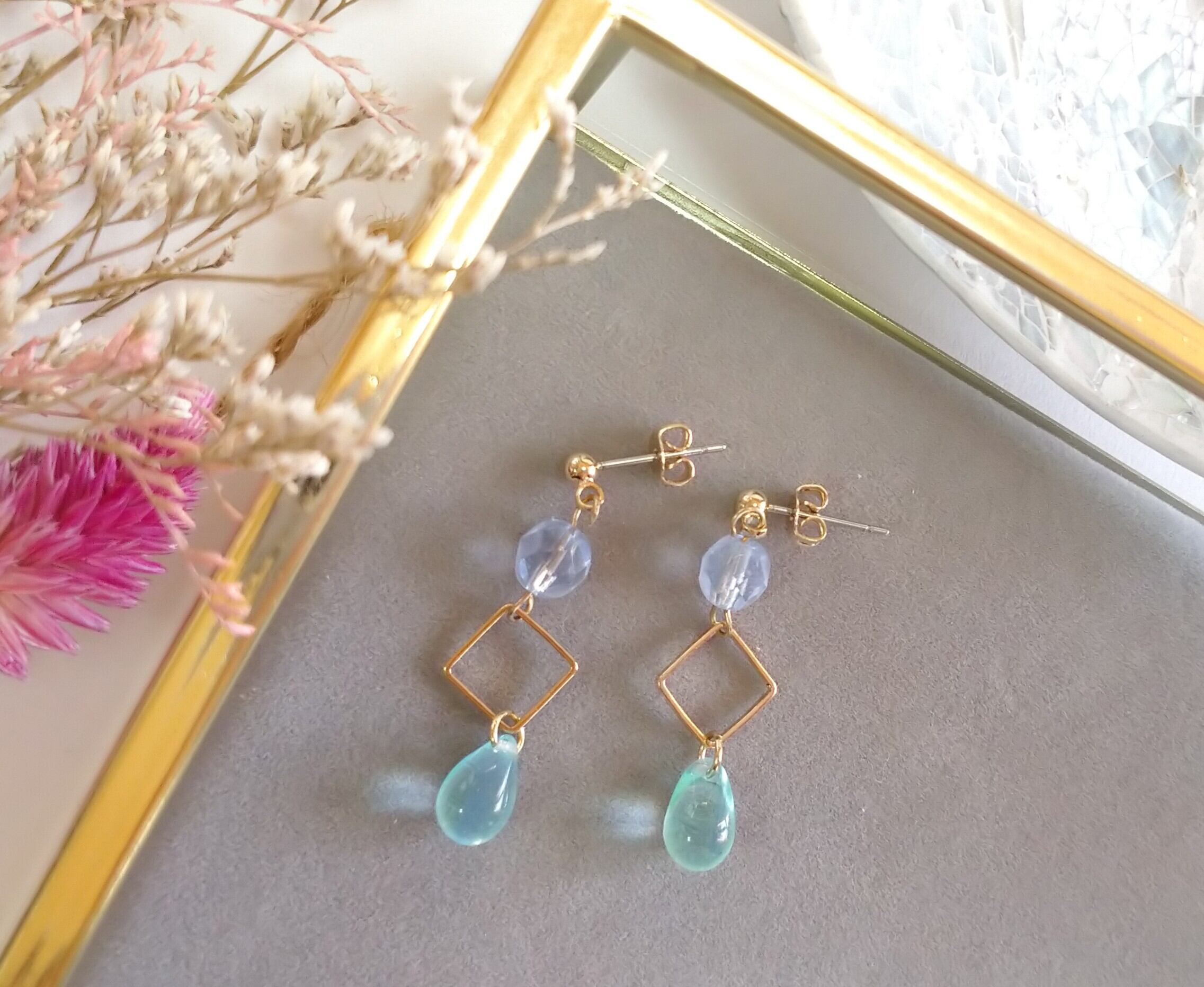 チェコガラスのドロップビーズを使用。 クリアカラーで爽やかさをイメージしています。 チェコガラス 9㎜ スクエアパーツ 10㎜ スワロフスキービーズ 6㎜ *ピアス、イヤリング、樹脂ノンホールピアス選べます