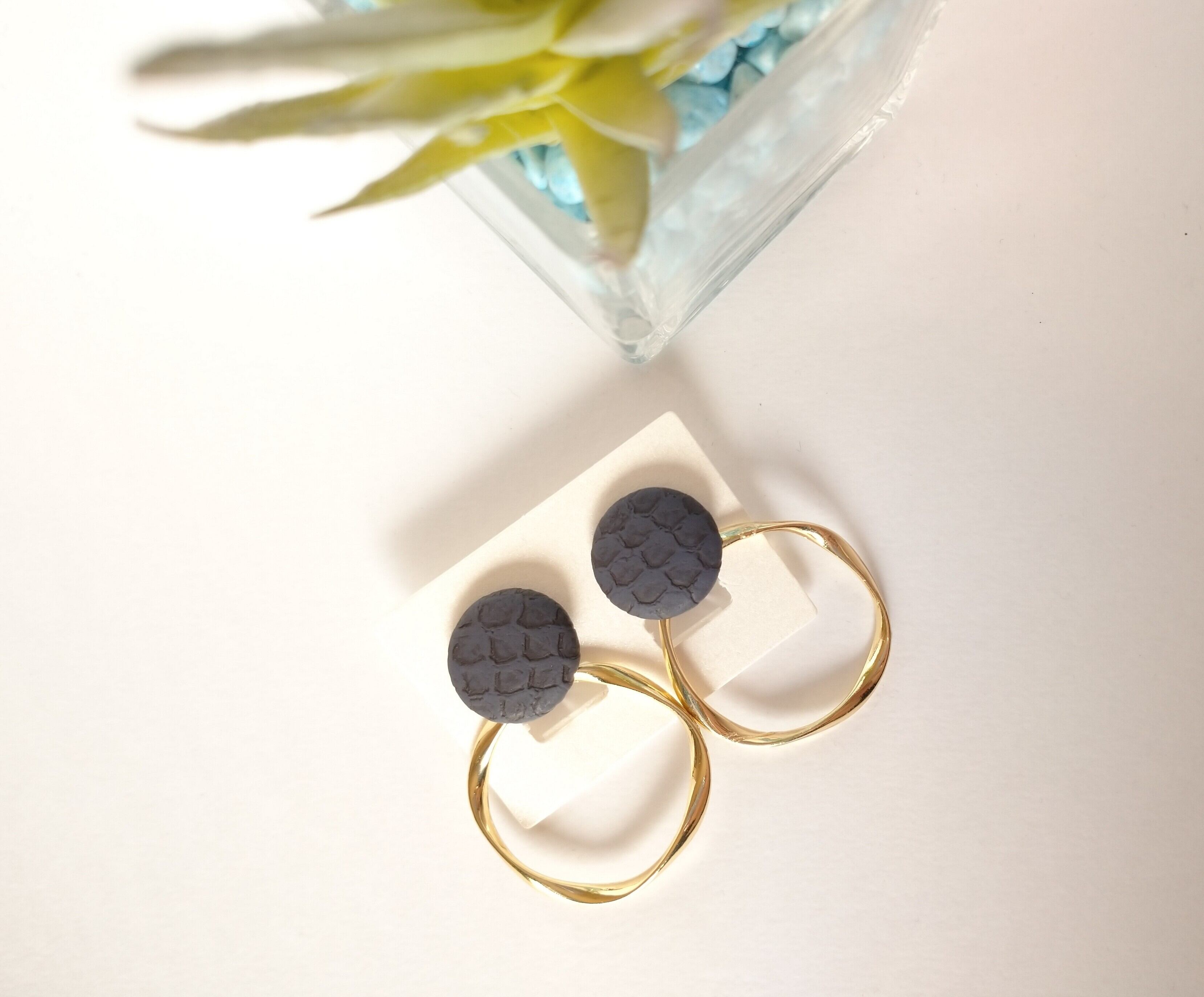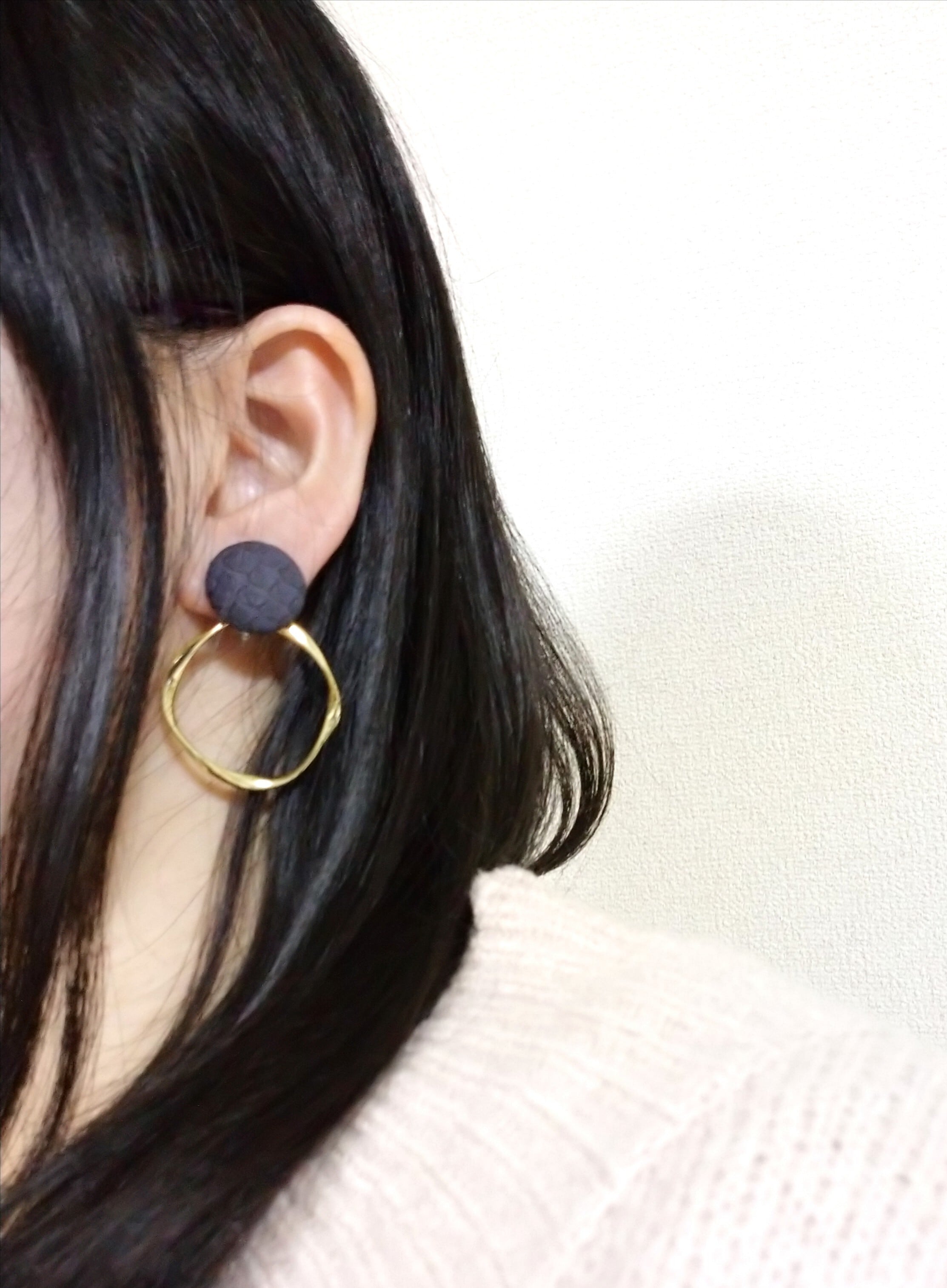 ネイビーのレザー風カボションのイヤリング。 ゴールドの大きめフープをつけています。 フープは取り外し可能です。 イヤリング金具はバネイヤリング。 全体の大きさ 約4.5cm カボションの直径 約18㎜ フープの直径 31㎜