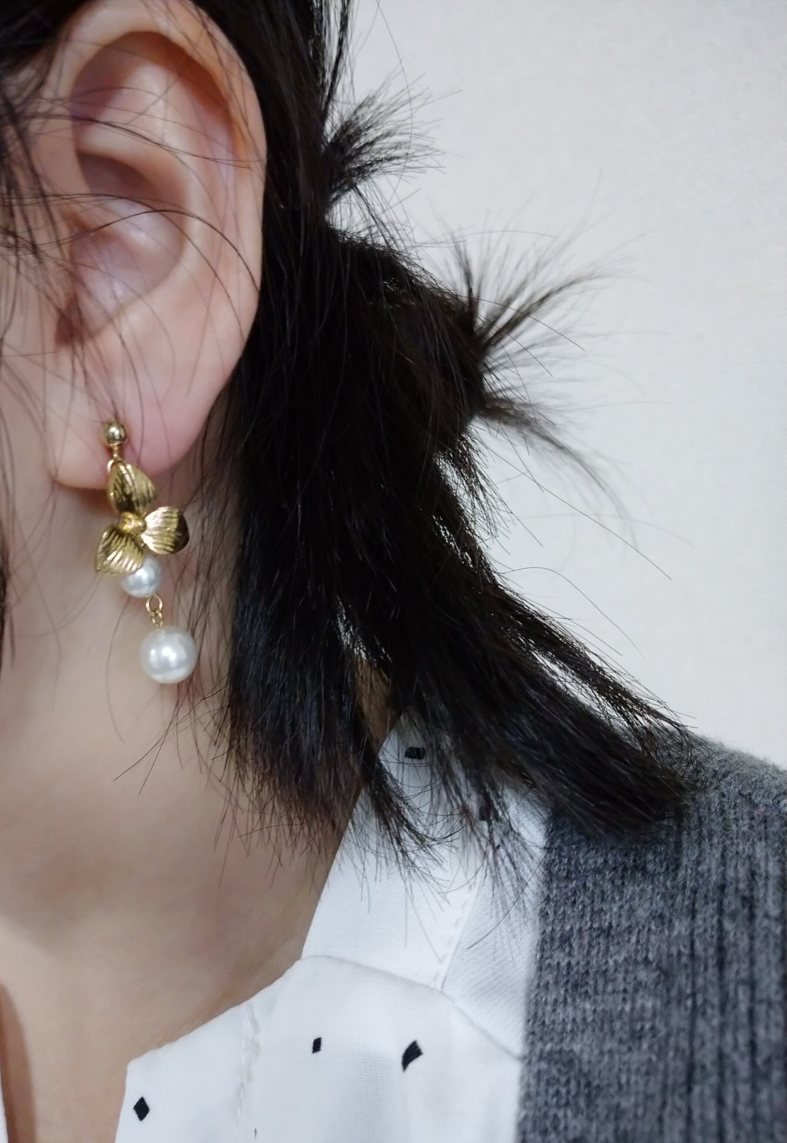 フラワーのゴールドパーツを使用したパールのアクセサリー。