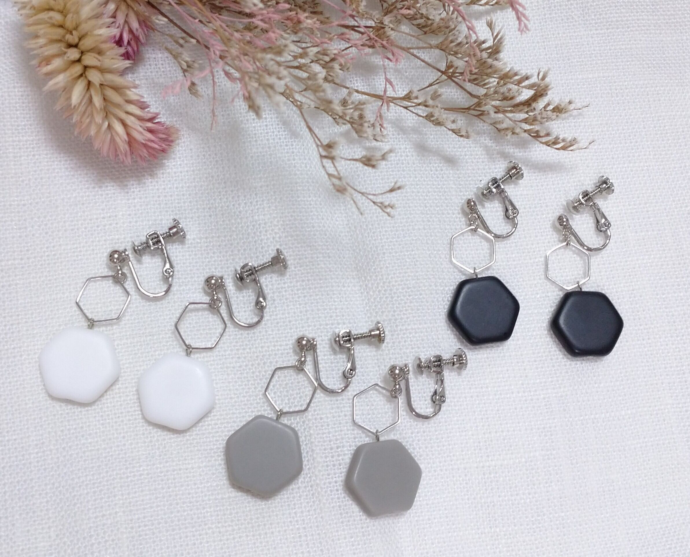 六角形のフランス製ビーズを使用したイヤリング。白の六角形ビーズで落ち着いた雰囲気に。